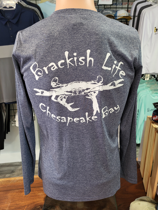 Seafoam Ladies Performance Long Sleeve V-Neck with Navy Logo with Slogan and Heron on Back