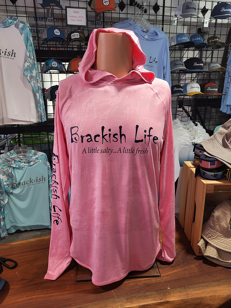 A Brackish Life best seller! 100% polyester performance UV with Hood with unisex cut… with Navy Brackish Life logo and our slogan “A little Salty. A little Fresh.” on front.