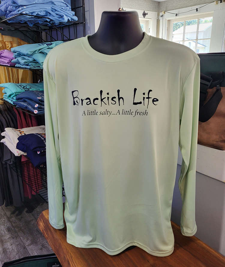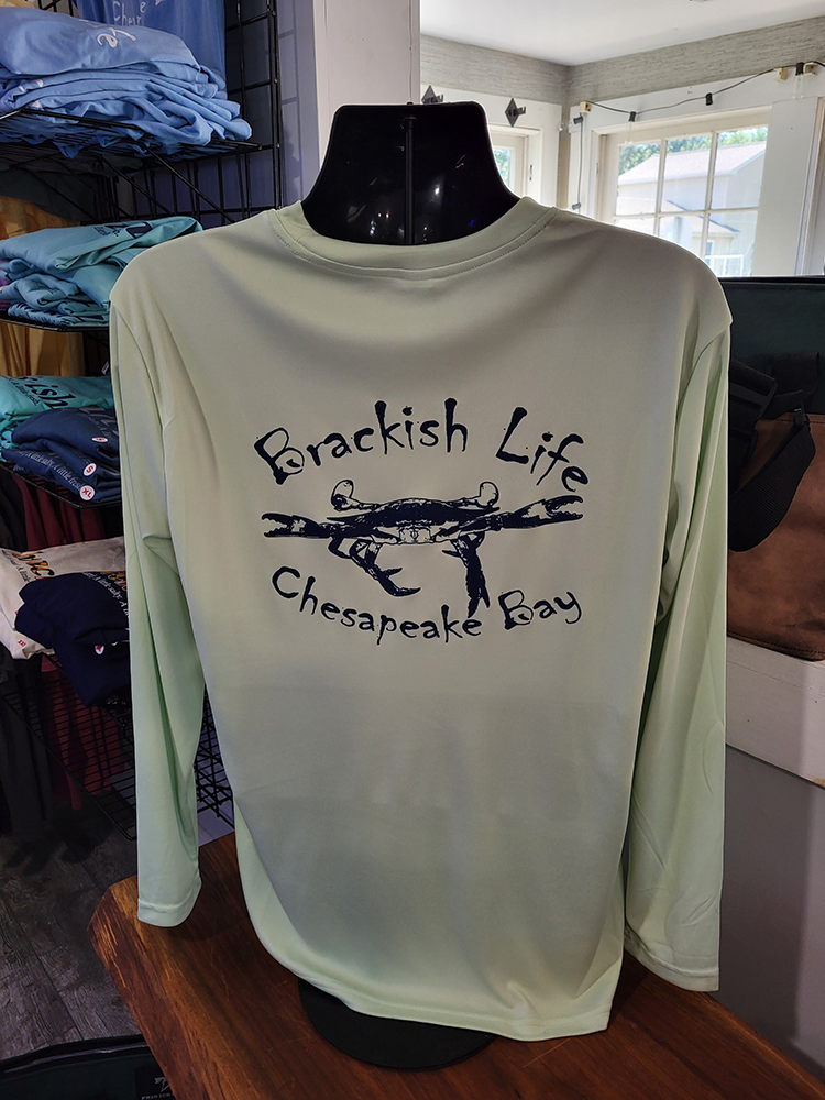 Olive Long Sleeve Crew with Navy Logo with Slogan and our signature Navy Crab on Back