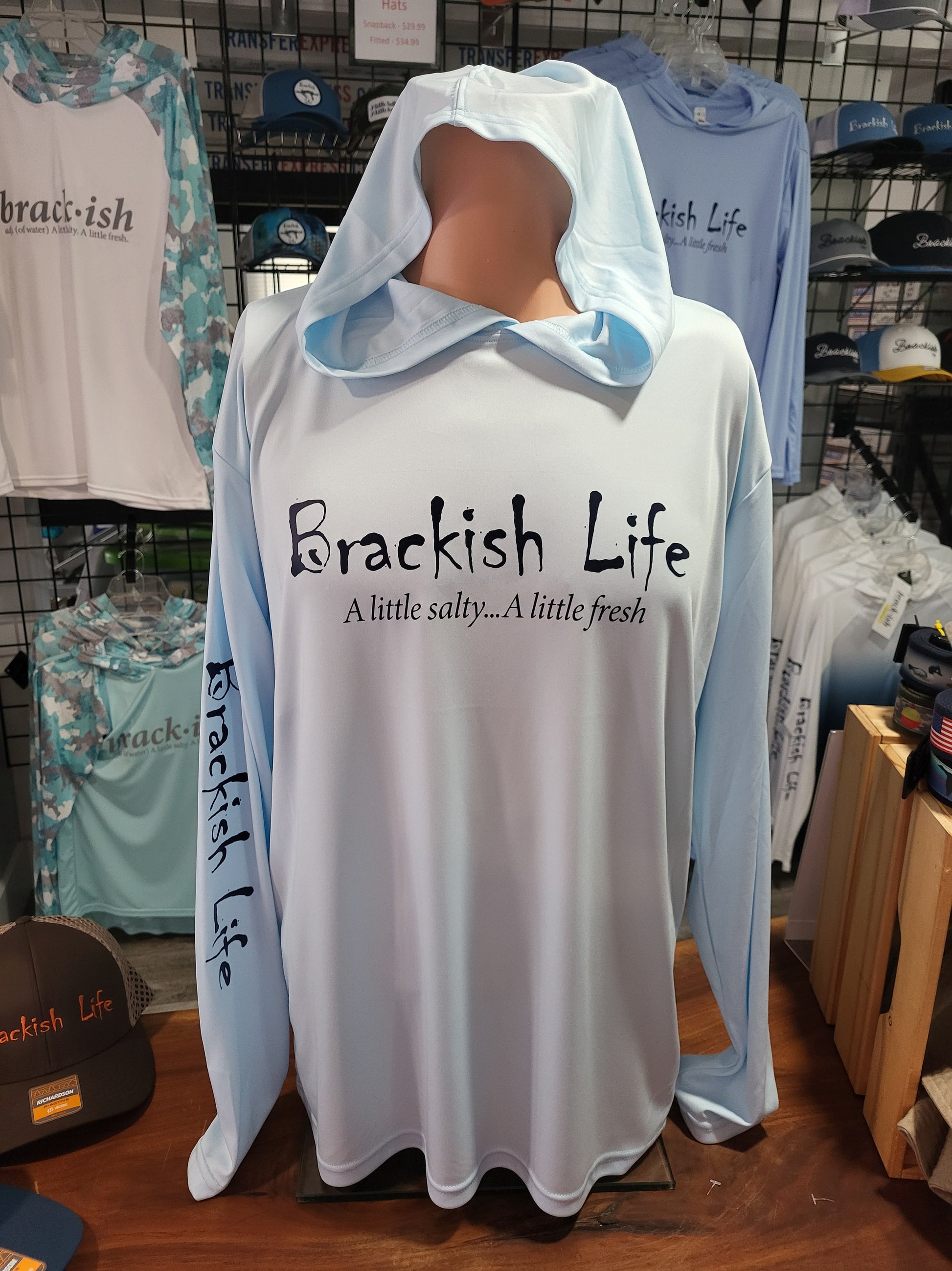 A Brackish Life best seller! 100% polyester performance UV with Hood with unisex cut… with Navy Brackish Life logo and our slogan “A little Salty. A little Fresh.” on front.