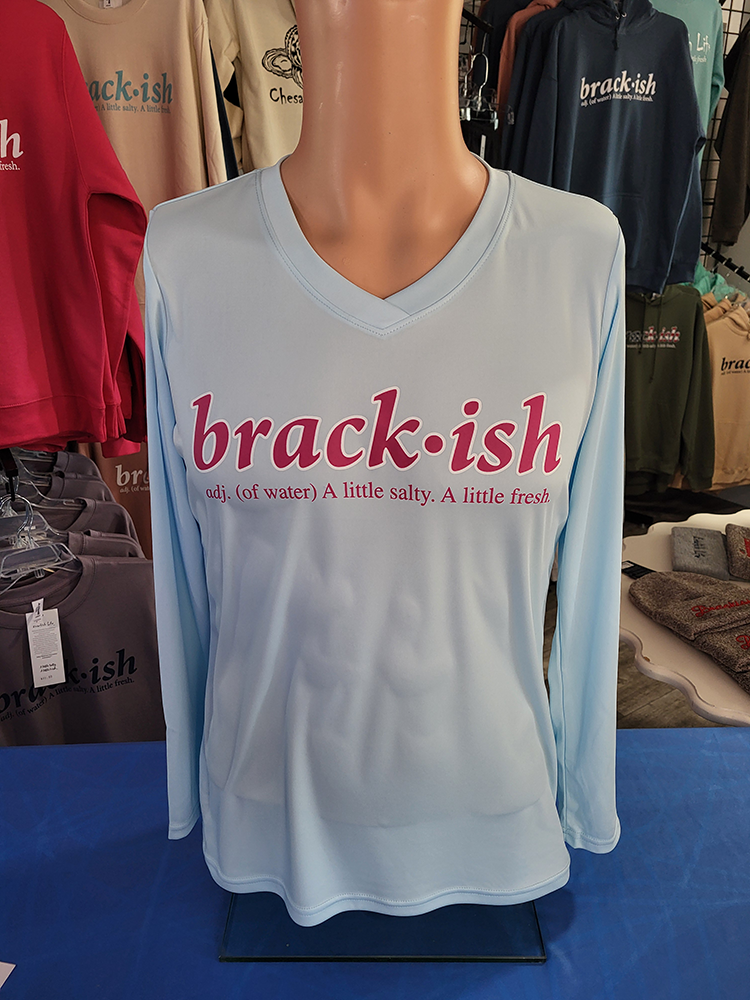 The perfect way to protect yourself in style is with one of our original shirt designs. The Brackish definition in Pink featured on the front of our Ice Blue long sleeve UV shirt with our Pink Dog on the back.