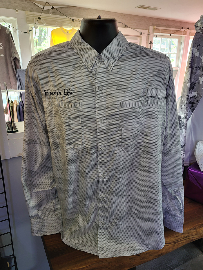 Long Sleeve 100% Ripstop Performance Polyester Captains Shirt. Brackish Life embroidered on the left chest and our new signature logo on the back neck. Lightweight fabric dries quickly