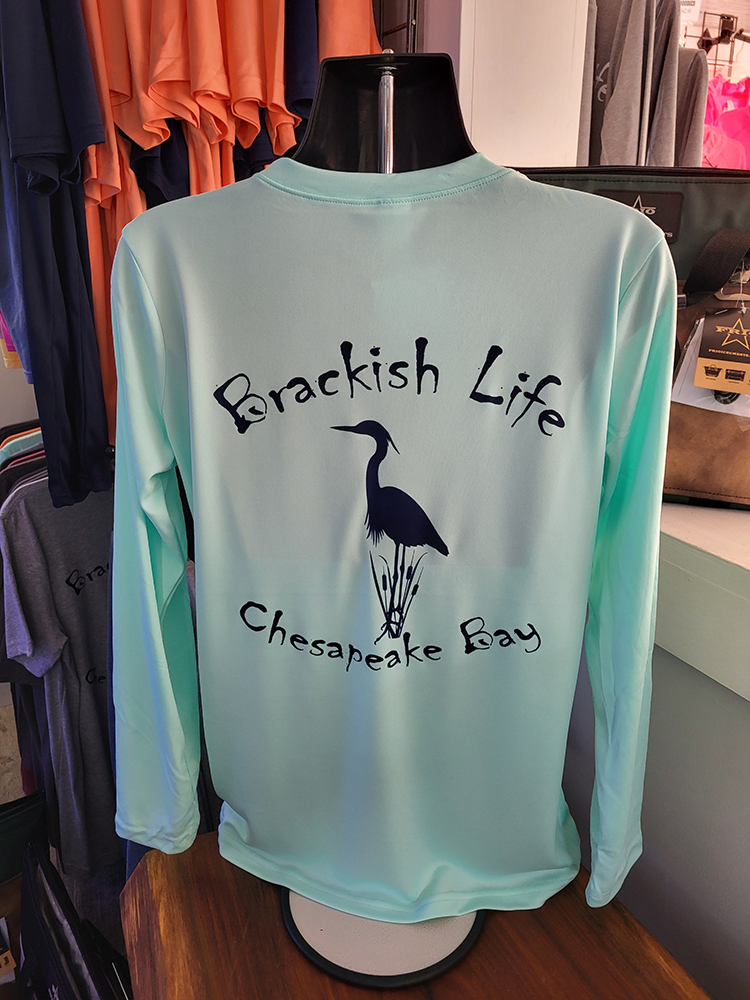 The perfect way to protect yourself in style is with one of our original shirt designs. The Navy Brackish Logo with Slogan featured on the front of our Seafoam long sleeve UV shirt with our New Navy Heron on the back.