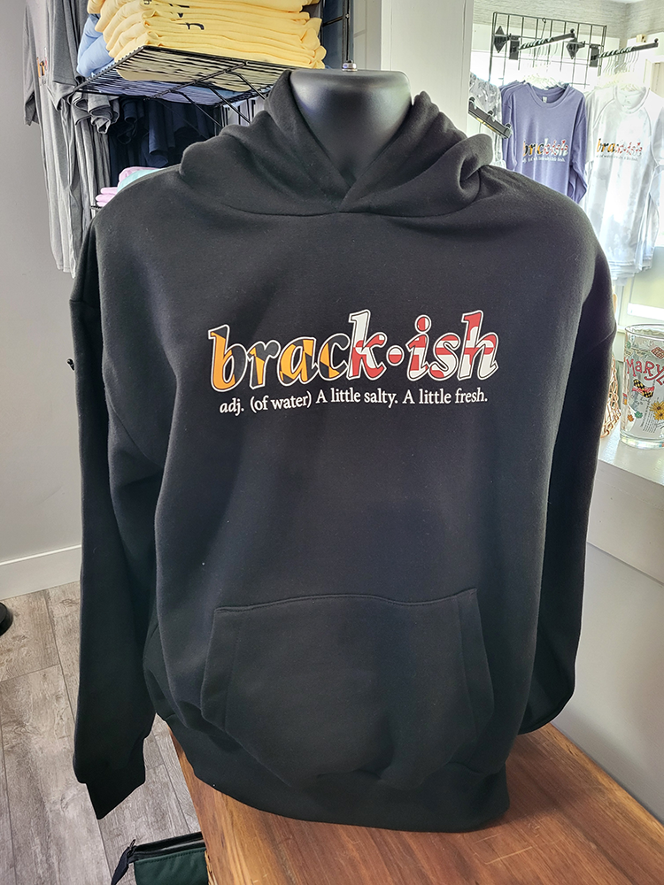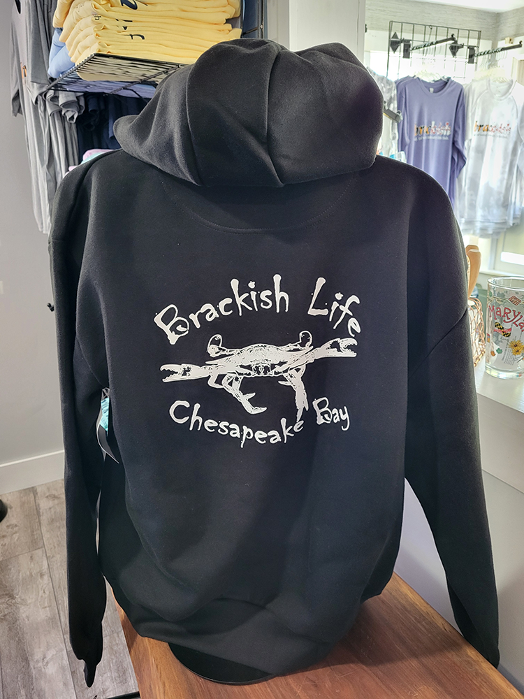 Brackish Life Black Hoodie with our Maryland Definition and Signature Crab on the back