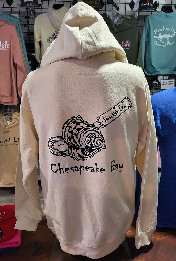 Vanilla Hoodie with our signature Oyster logo drawn by our good friend Sherry Smith on the back