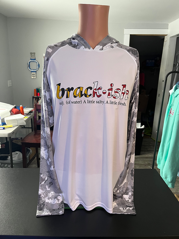 Hot off the press! Our newest product features a 100% polyester performance UV T-shirt with Hood. Unisex cut with a Silver Brackish Life logo and our slogan “A little Salty. A little Fresh.” on front and our crab on the back.
